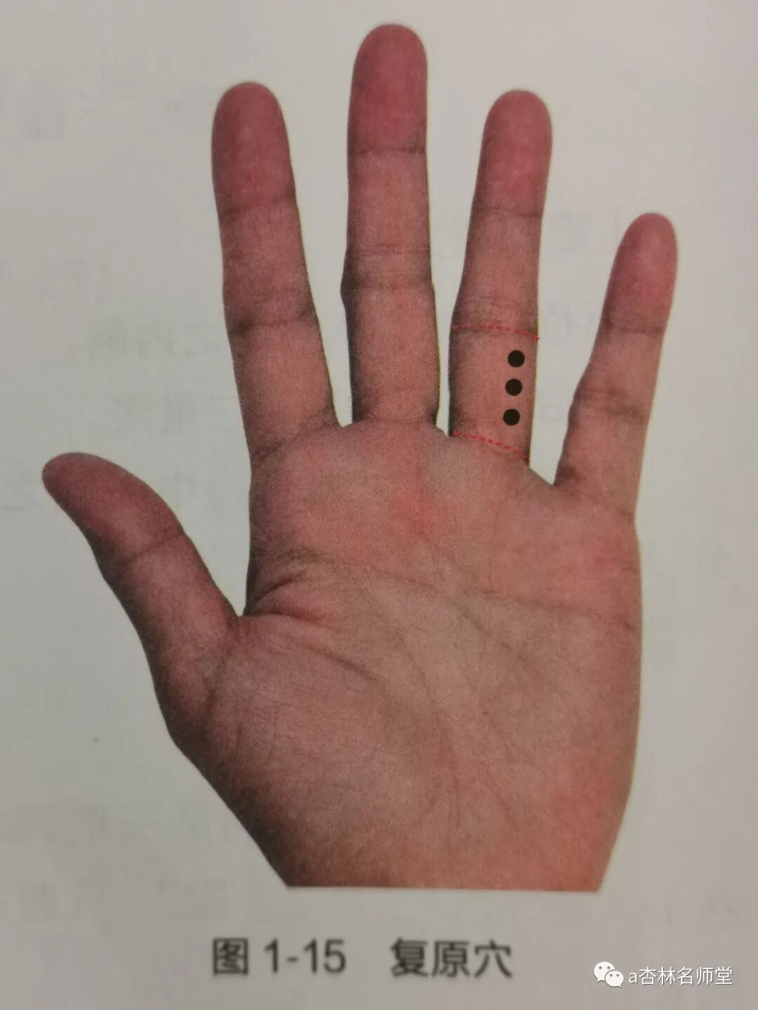 取穴:当掌面无名指之中央线外开二分直线之中点- -穴,其上三分-穴,其下三分穴,共三穴。