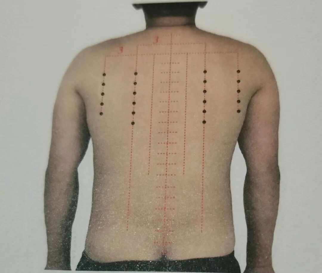 2.第四椎至第八椎,每椎旁开六寸各一-穴,计五穴。